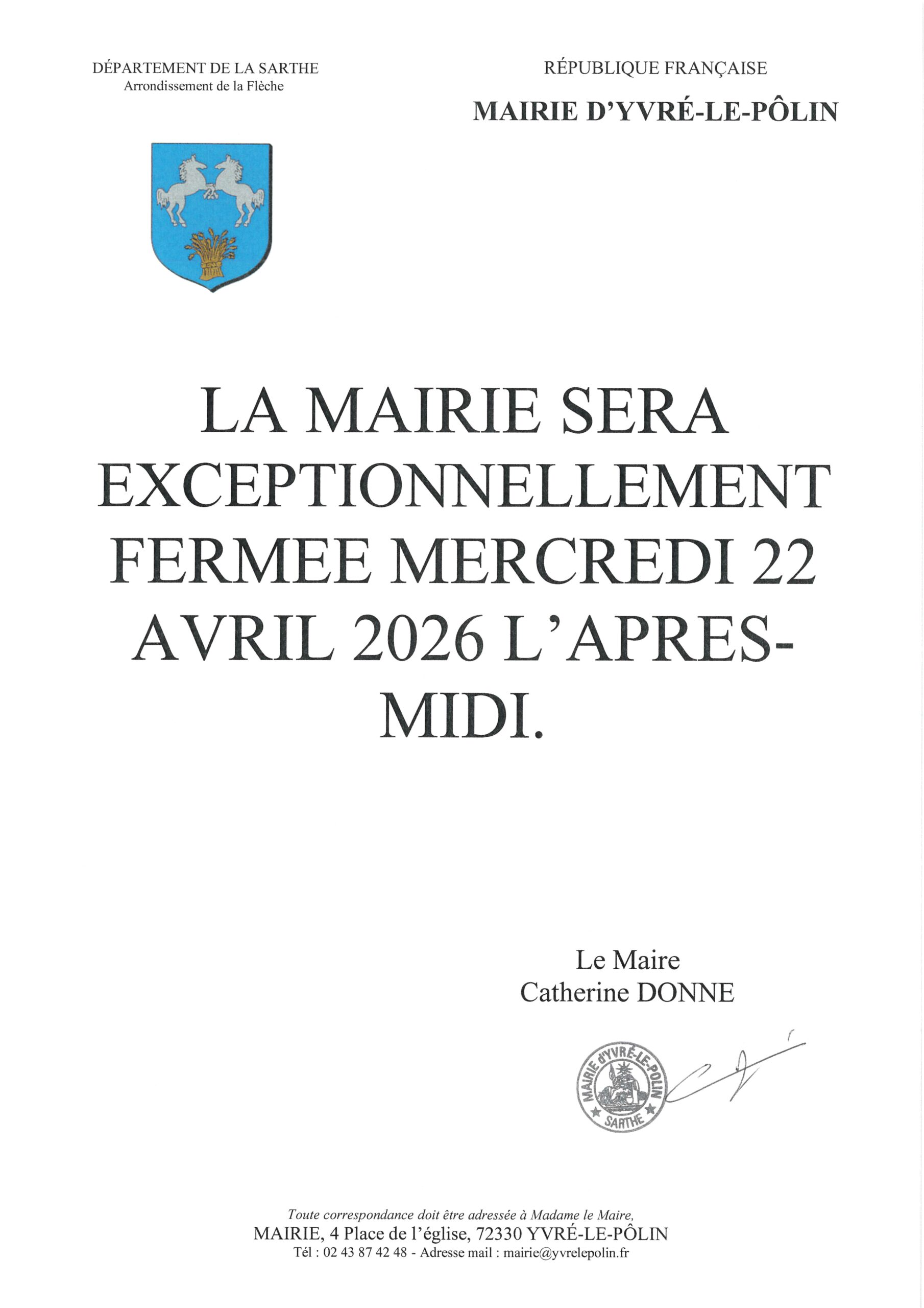 Information Mairie La mairie d’Yvré-le-Pôlin sera exceptionnellement fermée : Mercredi 22 avril 2026