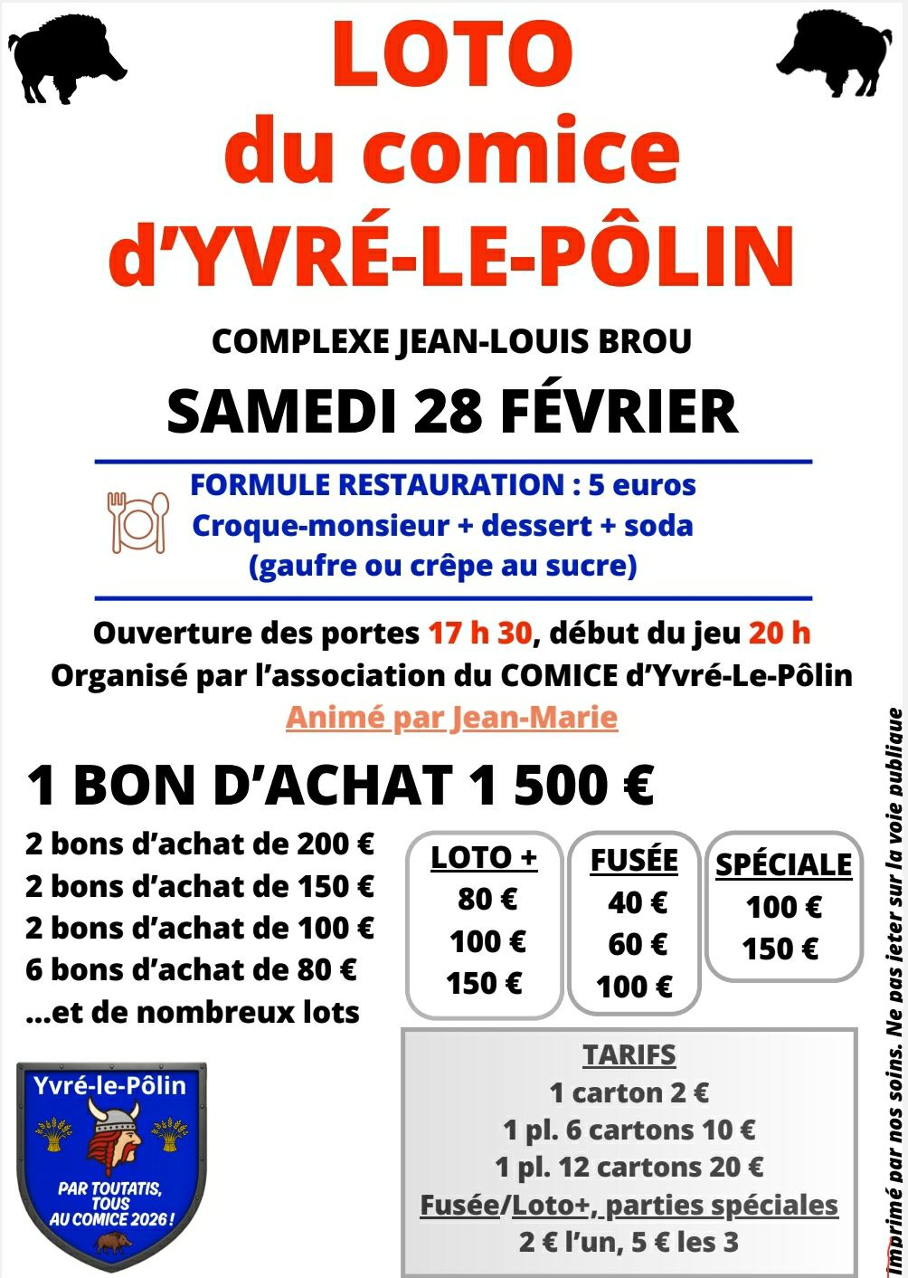 LOTO DU COMICE D’YVRÉ-LE-PÔLIN Samedi 28 février Début du loto : 20h Ouverture des